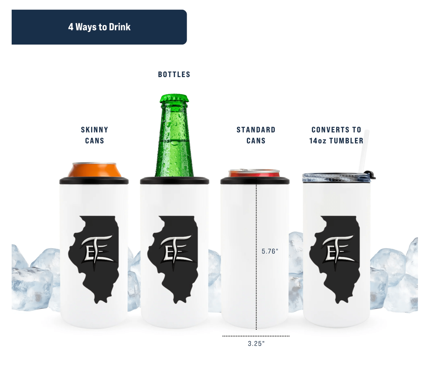 This 4-in-1 can cooler fits a 12oz short or skinny can or bottle, and includes two lids and a straw,